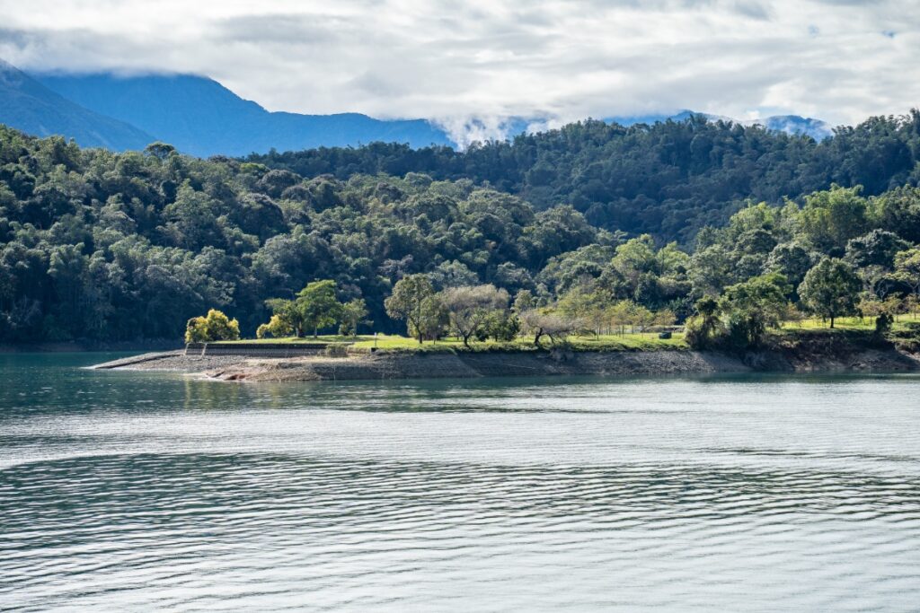 日月潭往頭社方向的「日月潭景點-水社壩堰堤公園」,潭水波光粼粼,碧藍的湖天相連,層層山嵐美景是情侶約會聖地,更是新人拍攝婚紗的人氣婚紗景點,故又名情人橋、婚紗壩,「日月潭景點-水社壩堰堤公園」同時是日月潭向山自行車道行經景點,沿著岸邊的木造步道漫步,或在堤岸草皮上休憩賞景,都是不錯的旅遊體驗。